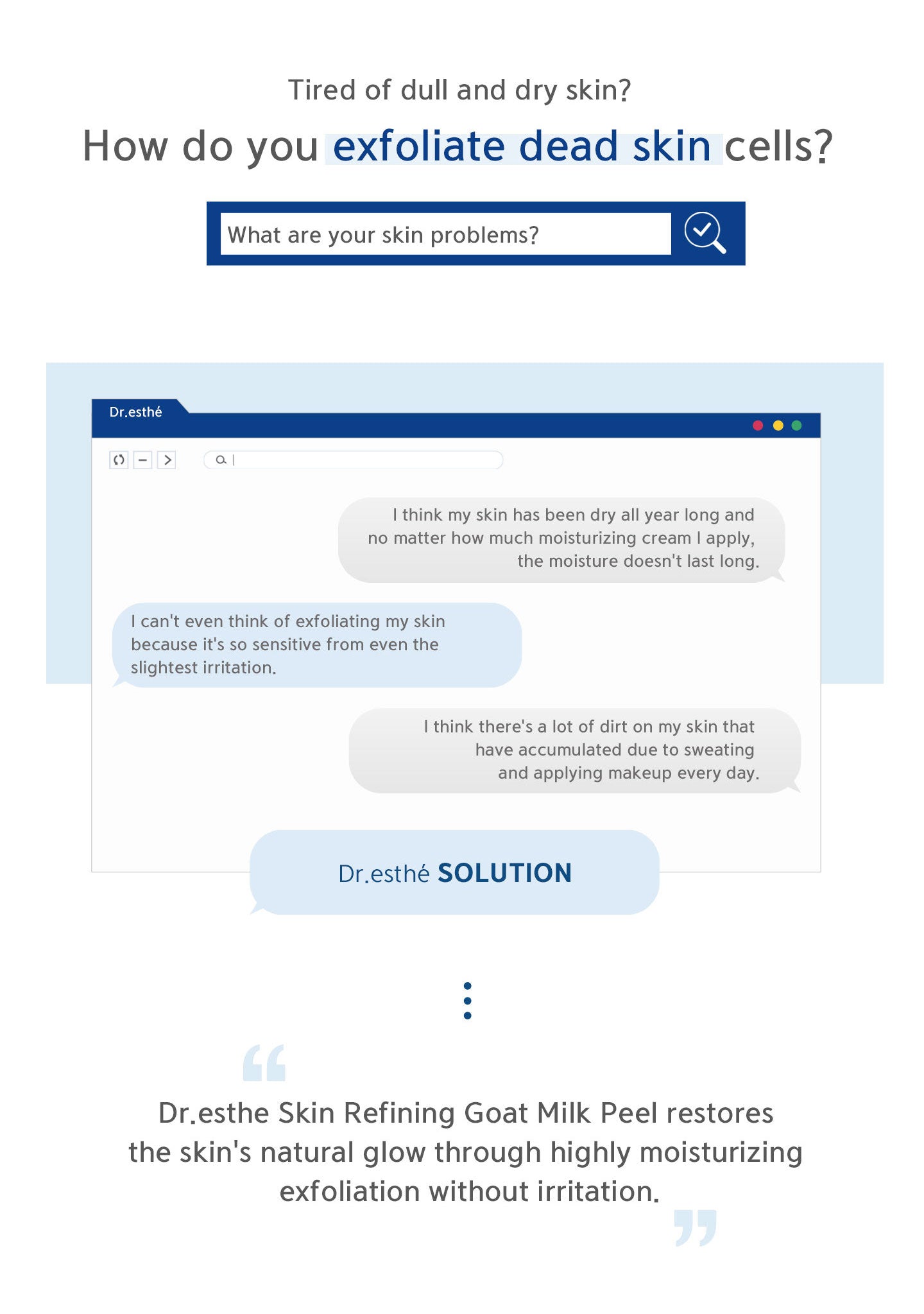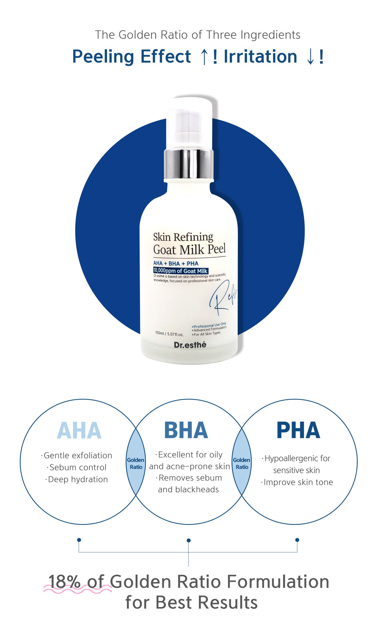 Hypoallergenic and extra moisturizing goat milk peel with the golden ratio of AHA, BHA, and PHA and 7500 ppm of goat milk extract to brighten skin complex.